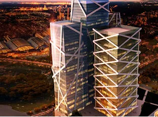 ●大楼整体的交叉纹理预采用LED灯效果,会不断变化,同时这个楼的设计采用的材料将是节能环保和一些高科技结合。整体设计融入典型的哈尔滨冬天元素,交叉纹理的白色和冬雪有机融合,衬托出冬天的神韵。同时,这些设计纹理还要和周边的环境互动,通过材料和灯光的折射,形成一个城目光的聚焦点。