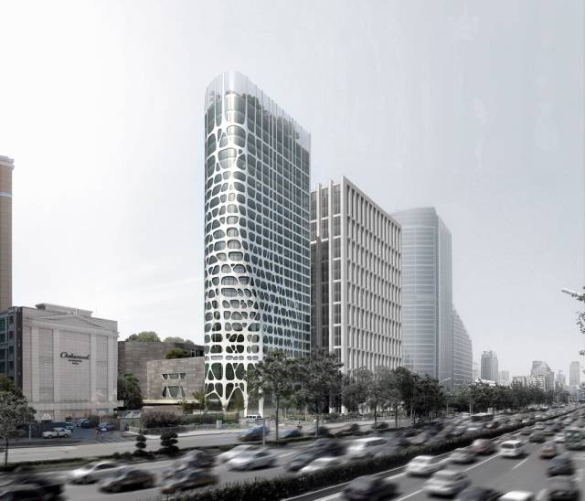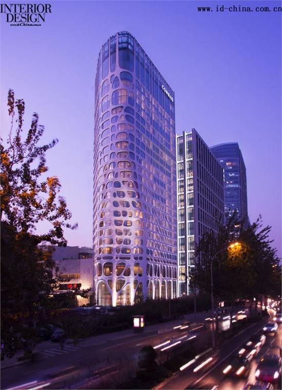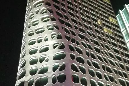 |整体构造:楼盘外衣孔洞密布,舍弃了方正的窗户造型;而酒店侧面如女子展现美腿,似一件穿着网状裙子的少女站在路边。尤其是夜晚的粉色,更是渲染了整条街道。