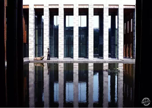 主入口一扇影树白墙与一个透明玻璃盒的简单并置,隐约透出博物馆的清高、雅朴,淡然的底韵。从玻璃盒子进入,沿着楼梯,依山势往下,进入的是狭长且半封闭的影竹廊。此处,山峦水景暂时退隐,视线所见是竹影,白墙,静水和阳光。当绕过幽暗走道,空间开始略为释放,飘莲池呈现眼前。