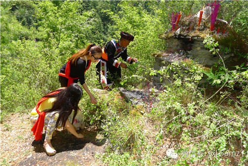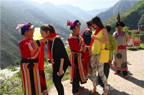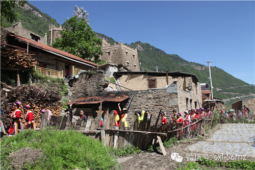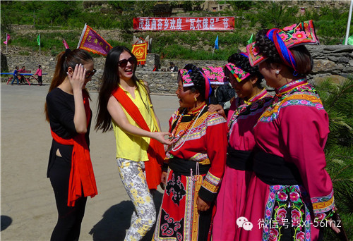 2位地球小姐来到瓦尔俄足的发源地——茂县曲谷乡河西村,在村口受到羌族寨民们“挂红”欢迎.。这条红色土布叫日麦旭布(Rrmea Xub-bu)即羌红,寄托着羌族人民示好、崇拜、尊敬等美好的情感因素,在迎宾、敬神、婚礼、寿礼等场合广泛使用,相当于藏族的哈达