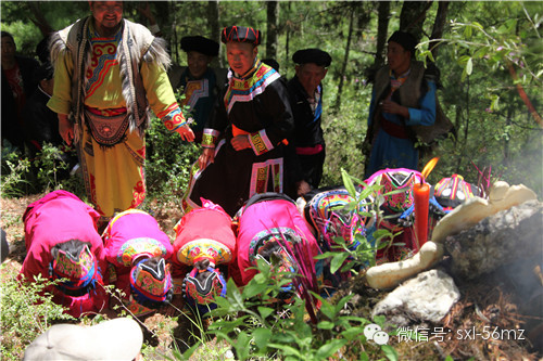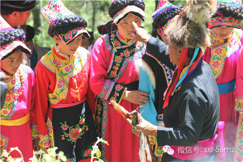 在释比的引导下,姑娘们一字排开跪拜天神、山神、祖先。这相当于羌族姑娘的成人礼。接下来,寨中有威望的妇女会在私密环境中教授她们“做女人应该知道的事”