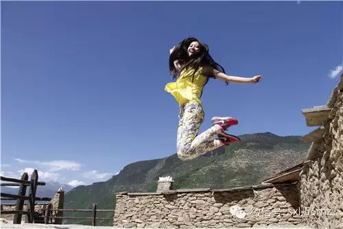 以蓝天、群山为背景,地球小姐中国赛区冠军相杨在“官寨”的碉楼顶部跳跃。河西村的官寨建于清代中后期,历经四代人才逐渐完善。占地600平米,6层20米高,48间房、88扇窗,是典型的羌族建筑,各层有楼梯连通,内天井、走马转角、回廊环绕,四通八达,颇见心思