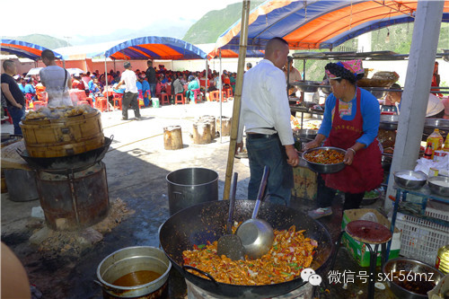 敬山祭祖活动结束后,寨民们回到羌寨中,开始吃粑粑饭。今天开了34桌,饭菜极其丰盛,帮厨的寨民们忙得不亦乐乎。羌族寨民好客,来人越多他们越高兴