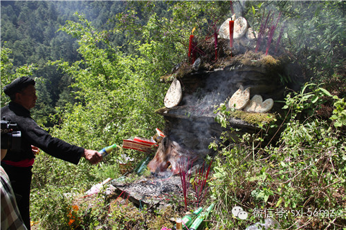 到达山顶的祭祀地点,释比(羌族神职人员、有威望的民间巫师)将太阳、月亮、腊猪头等供奉在神台之上,以自酿的咂酒敬山、敬神、敬祖。这个只有一米多高、四层方塔就是羌族的祭祀塔,虽然不像藏族的佛塔雄伟威武的,但其宗教意义是一样的