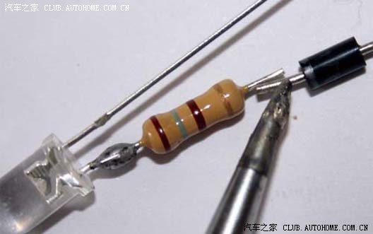 重点提示:购买LED灯泡时,若不知搭配的电阻与二极体规格的话,可以询问现场的工作人员,会比自行上网寻找资料来得快上许多,另外焊接负极线於灯泡上时,尽量焊在二极体旁,包覆起来后才可避免接触到正极线而短路。