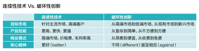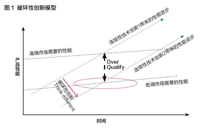 克莱顿·克里斯坦森的《创新者的窘境》一书,揭示了两大“宿命性”现象的内在规律:在基于连续性技术的竞争环境中,领先企业往往无人能及;而在破坏性创新出现的竞争环境中,领先企业常常落败。其分析的基础原理是:任何一个行业,只要有明确的客户及需求,通过技术的进步就一定能够实现。因此,行业中的领先企业必然能够通过连续性技术的进步使产品性能满足主流高端市场的需要。然而在这一过程中,逐步提升的产品性能总有一天会超出低端市场的需要成为浪费,而领先企业却往往只会考虑自己能为主流客户做些什么,从而为竞争者创造了巨大的机会:低端市场已无人提供合适的产品。
