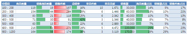 整体把控属于明确问题的范畴,只是发现问题,具体的实施建议要放到各个价格段里的进行具体说明。整体把控主要是看量,然后看对应的销售高(低)的对应的商品数是否够丰富,用动销率、销售额、单品件数作为参考,定位问题所在。以上面的数据为例: