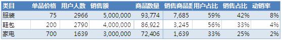 类目的整体分析主要看类目的主要销售商品的价格是多少,覆盖人群是多少,总体的商品数量是多少,分别的占比是多少。