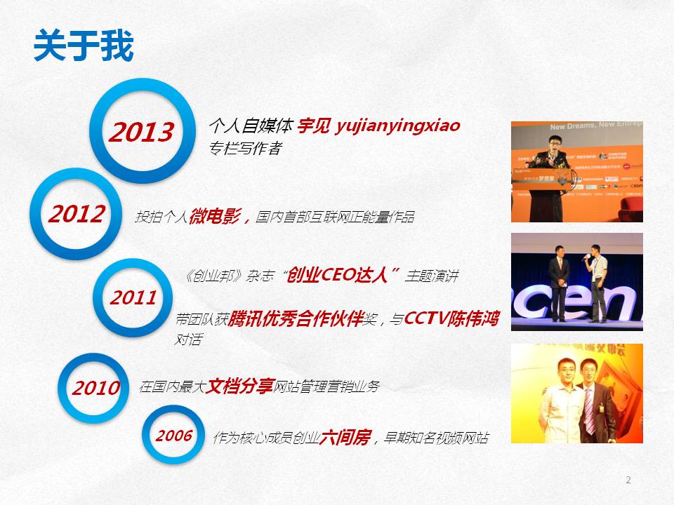 先简单自我介绍一下,我过去的从业经历应该说一直没有偏离市场营销这条主线,2006年跨足到互联网,刚好赶上了视频网站的创业热潮,作为核心成员参与了六间房的创业;