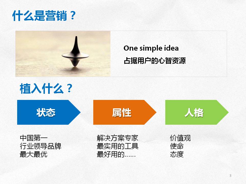 植入什么具体“想法”呢?《盗梦空间》同样给出过一个非常隽永的表达,叫做One simple idea,就是说你给到用户的这个Message必须足够简单,才容易被用户接收、理解、并消化形成他自己的东西。