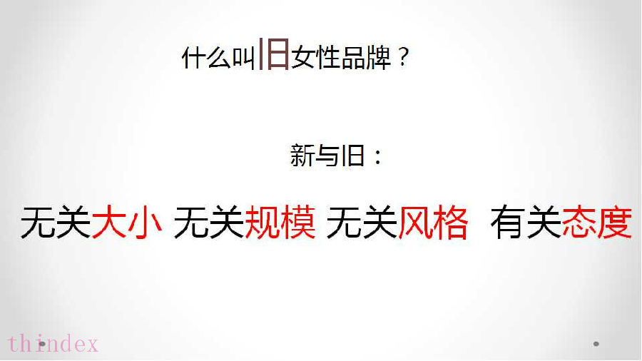 什么叫做旧女性品牌?新与旧的区别,首先是无关大小,不管这个品牌大、小,跟新旧没有关系,跟规模也没有关系,很多国际知名品牌,包括百年品牌,也可能是一个旧女性品牌。第三这个风格没有关系,跟你的领域没有关系,不管是服装、化妆品,跟风格没有关系。http://mmbiz.qpic.cn/mmbiz/9OJibu00Pb7uUBAg7IDjcHogXMU02ibyz7SiajjJusNEUkQGM2GEFE9HfQgRD38aXBOBo7NgtTlx4kZJVOMf0q0fA/0