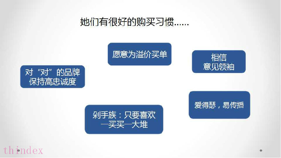 当然有很好的一点,她们购买习惯很好,购买力比较强,愿意为品牌溢价买单。同样的产品,同样功能的产品,把溢价做出来了,价格翻一倍,无所谓,我愿意为这个范买单。只要找到在她们那个领域合适的意见领袖,他们很愿意相信个人的。当然他们很自恋,易传播。他们的品牌忠诚度是很高的,很多人在去年一直在宣扬说得屌丝者得天下,但经过我个人的亲身经历,我发现其实屌丝经济有非常多的弊端,第一没有契约精神、第二屌丝忠诚度很低,只关注产品本质功能,一旦发现另外一个,很快就变心了。但女生不一样,有品质的女生追逐品牌的溢价和感觉,对品牌忠诚度是非常高的。对于品牌消费来说,这个人群是非常好的人群。