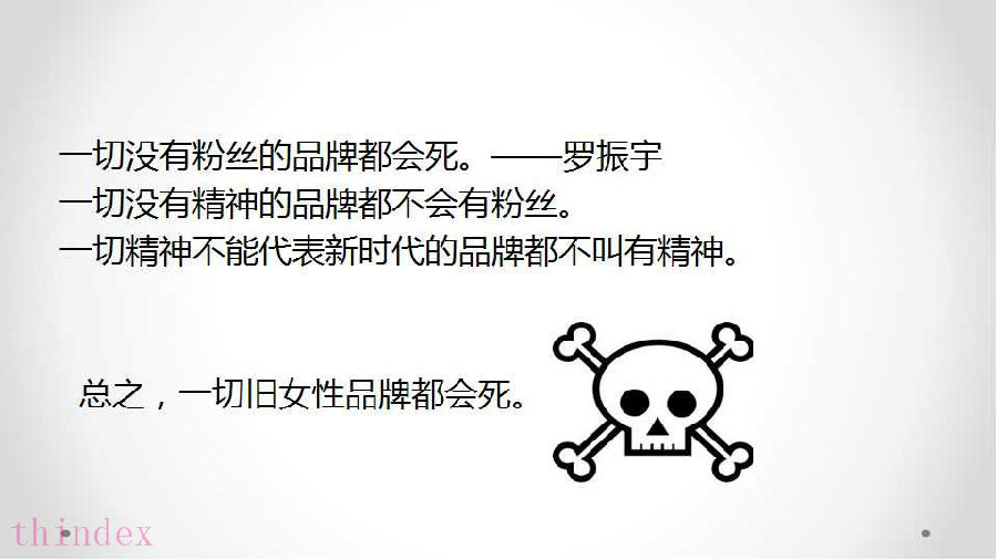 罗振宇说一切没有粉丝的品牌都会死。那一切没有精神的品牌都不会有粉丝。一切精神不能代表新时代的品牌都不叫有精神。结论,一切的旧女性品牌都会死。