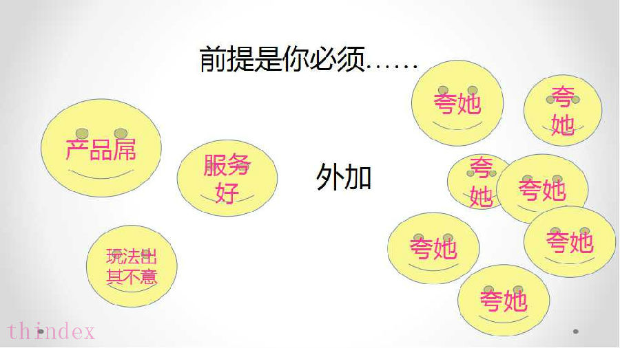 但前提是产品很屌,这个跟好不一样,得好、酷、出其不意、服务很好、玩法出其不意,外加一万个夸她。当你发现搞不定女朋友的时候,就是你夸她夸的不够多。其实也没有那么难。http://mmbiz.qpic.cn/mmbiz/9OJibu00Pb7uUBAg7IDjcHogXMU02ibyz7W1RKhN0SVK5ibApibiczKU8neIB5RW0URISItghELHuj9uXwsxiaJRHgUQ/0