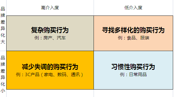 (看专业术语头疼者,这一段可以自觉绕道)如上图,消费者购买决策过程的复杂程度不同,其中最主要的因素是参与程度和品牌差异大小。同类产品不同品牌之间的差异越大,产品价格越昂贵,消费者越是缺乏产品知识和购买经验,感受到的风险越大,购买过程就越复杂。