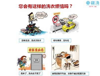 我们理解用户的心理,不愿意自己洗衣服的人一定是一个非常珍惜时间喜欢自由的人,肯定希望洗衣店能归还他时间、自由。大部分的情况是我拿了一堆衣服,我要站在那等洗衣店给我看这个衣服有没有坏,这个衣服的价格是怎么样的,他有100多种价格,羽绒服是有长、中、短三种价格的,它的洗衣成本大致没什么区别,这是一种为了自己的利益防备用户的心理。