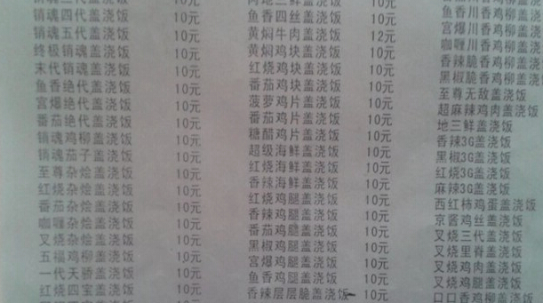 “饿了,来个盖浇饭吧!”老板说到,顺势递给我一张菜单,上面写着: