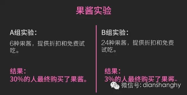 最后研究者发现,在提供6款果酱的组中,有30%的试吃消费者选择了购买;而在提供24款果酱的组中,只有3%的人最终选择了购买。