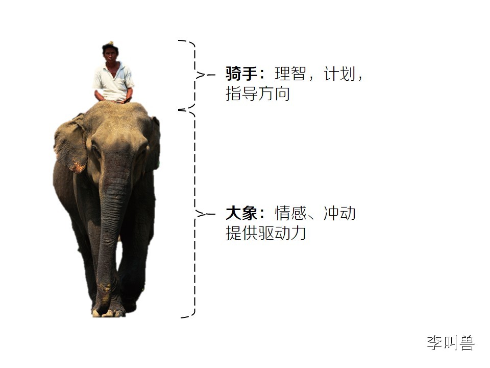 如果把人行为的过程比作“骑大象”,那么系统2相当于骑手,它负责掌管方向;系统2相当于大象,它负责提供动力。更多的时候,骑手难以控制大象,就好像理智很难控制本能。