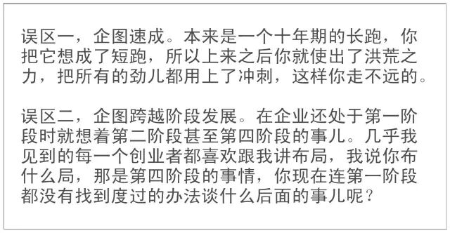 这个阶段,核心要点是专注,集中全部人力、物力与财力于本阶段的任务上,所有以规划、布局等等名目的不专注都会降低企业渡过此阶段的可能性。
