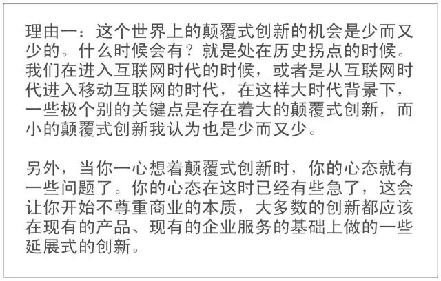 特点二:愿景很强。上来就说我面对的是一个几千亿、几万亿的市场,我未来是一个入口级的公司、平台级的公司,我要颠覆谁。我个人认为,其实颠覆式创新可以放到一边去了,作为创业者,你不要再想颠覆式创新了。