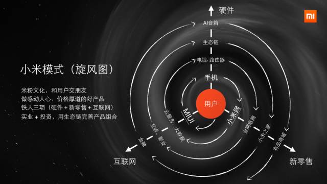小米本身专心专注做好的,是围绕用户最紧的几项,手机、MIUI、电商渠道。随着旋风图外延不断扩大,小米通过投资和协作,组建起庞大的综合生态“舰队”。