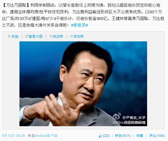 该微博矛头直指万达及万达董事长王健林,称“万达乃国耻”、“王健林首富身乃国耻”、“万达胜之不武”。