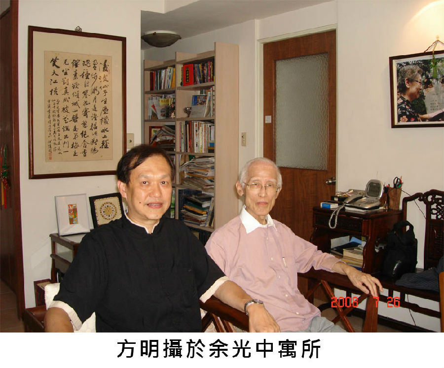 从方明在余光中寓所的照片,能看到余光中的家。墙上挂着一幅书法,是北宋黄庭坚的《王充道送水仙花五十枝,欣然会心,为之作咏》,借用曹植《洛神赋》典故,赞美水仙花)。另一面墙上,挂着余光中夫人范我存的照片。书架上,都是书,有些杂乱。门口,摆着一个固定电话,你想知道余光中的电话号码是多少吗?看来,余先生也不用手机。