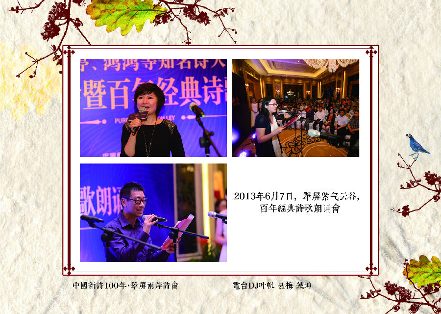 2013年9月29日,中国新诗100年·翠屏两岸诗会之“因为风的缘故——两岸经典诗歌朗诵会”,在绿城水晶蓝湾举行。