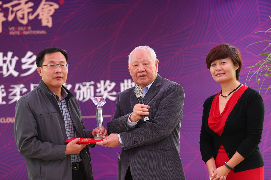 洛夫为柔刚诗歌奖获得者王夫刚颁奖。