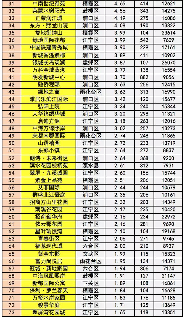 全市销售套数第1名,六合的龙湖半岛花园1467套。第2名,浦口的旭日上城1119套。第3名,浦口的明发新城中心882套。第4名,浦口的天润城881套。第5名,浦口的威尼斯水城809套。第6名,仙林湖的新城香悦澜山744套。第7名,仙林湖的金地湖城艺境673套。第8名,江宁滨江的绿地国际花都542套。第9名,江宁上坊的中粮鸿云529套。第10名,江宁麒麟的中海国际社区457套。