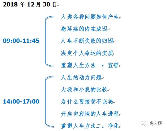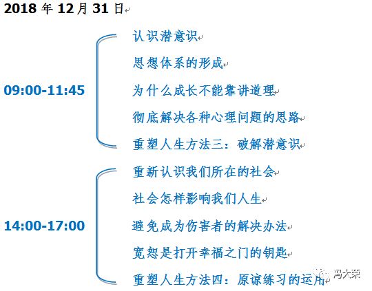 或许前面的种种并没有涵盖你的特殊问题,但其实所有的问题都只是外在的表象。重塑人生心灵成长工作坊将带领你重新认识自己的人生,改变自己的命运,新的人生旅程将从这里开始。冯大荣老师可以帮助你真正意义上的重塑自我,因为他是一位真正的觉醒者。