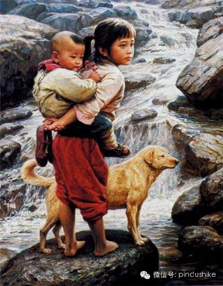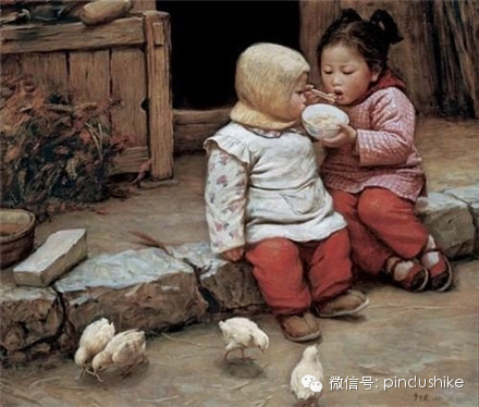 姐姐在给弟弟喂饭,还要吹一下,以免烫伤。在农村,以大带小,是最常见的,最纯洁的兄妹(弟)情谊,血浓于水的感情啊,大概今天独生子女很难想象。