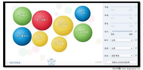 在新版本的谷歌音乐搜索中,谷歌着重推介了“泡泡挑歌”服务,根据用户设定的歌曲条件——诸如节奏、声调、音色、年代、歌手、流派和语言,提供给用户歌库中已有的正版歌曲。同时,谷歌还分析每一首歌的节奏等信息,提供“相似歌曲”服务。