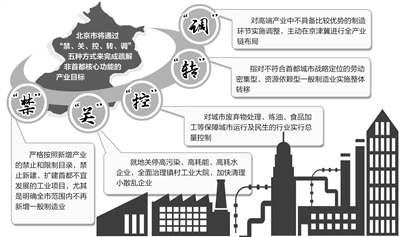 事实上,在今年北京市两会上,疏解非首都功能已经被提上议事日程。北京市政府工作报告提出,加快疏解非首都核心功能。严格控制增量,有序疏解存量,对不符合首都城市战略定位的功能和产业,逐一列出清单,拿出具体方案,尽快组织实施,确保取得实质性进展。为此,北京市将通过“禁、关、控、转、调”5种方式来完成疏解非首都核心功能的产业目标,如严格按照新增产业的禁止和限制目录,就地关停高污染、高耗能、高耗水企业,对不符合首都城市战略定位的劳动密集型、资源依赖型一般制造业实施整体转移,对高端产业中不具备比较优势的制造环节实施调整,主动在京津冀进行全产业链布局等。
