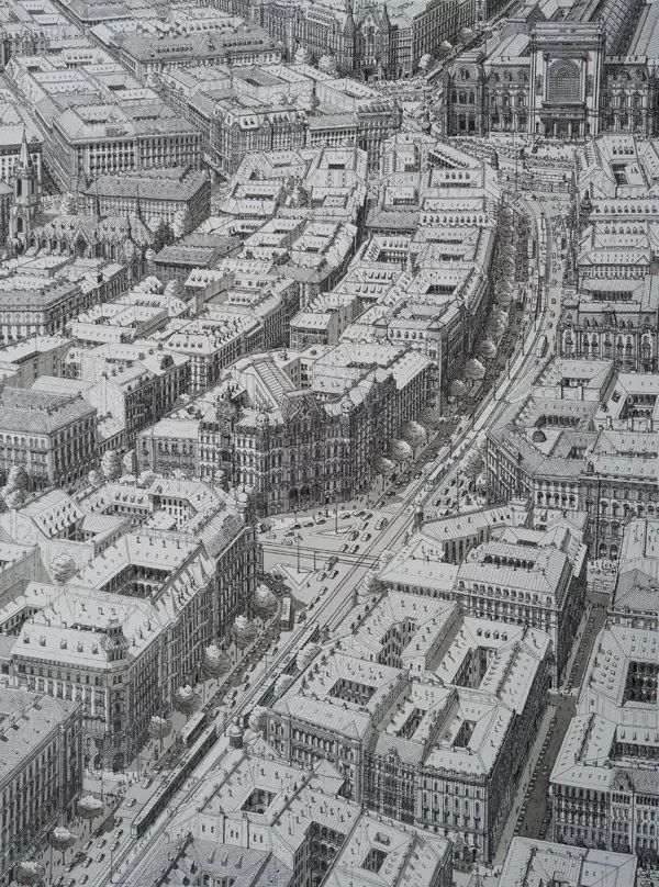 站在上帝的视角,他微微的俯瞰着城市,将这座庞然大物的零件精确的表达,仿佛在告诉我们,城市是宏大的,我们是微小的!