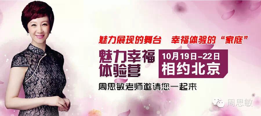 10月19-22日 周思敏老师亲自主讲的【魅力幸福体验营】。如何做一个魅力幸福的女人,拥有幸福家庭。答案尽在这里!最后名额,报名速从!