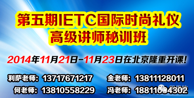 “【IETC国际时尚礼仪 高级讲师】”秘训班将于11月21日-23日在北京开班,国际时尚礼仪教育专家周思敏老师亲自授课,逐一辅导,名额有限,过期不候。