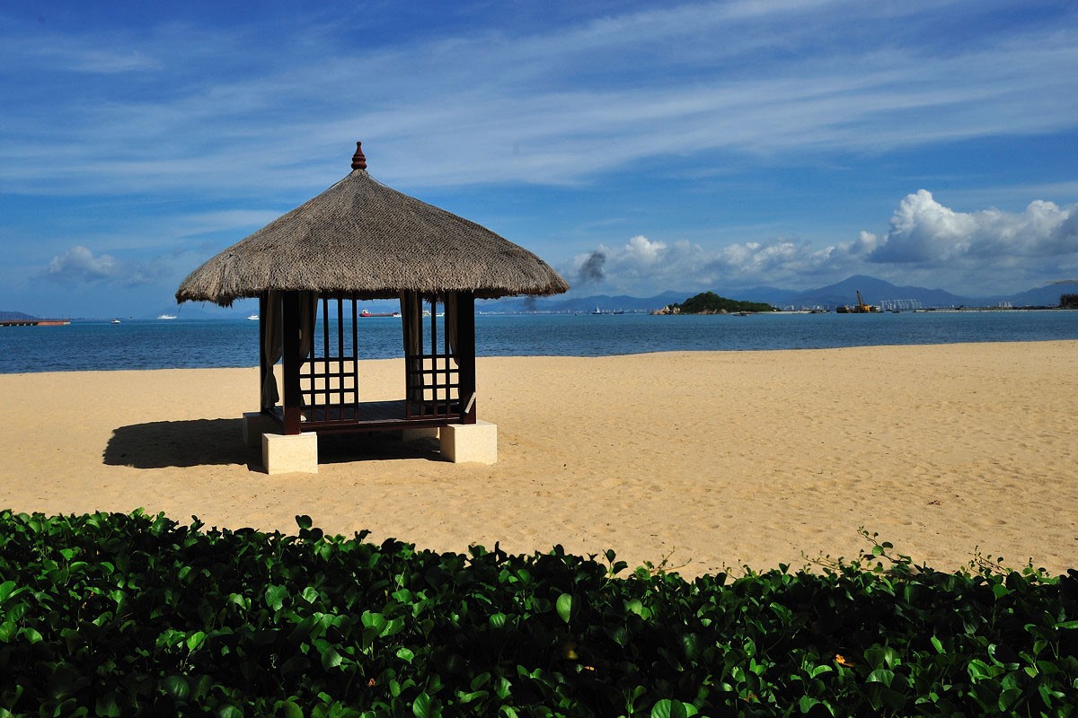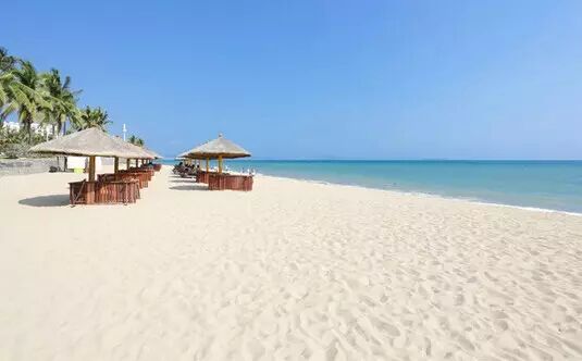 三亚悦榕庄独享了800公尺长的海滩,拥有500公尺观海栈桥,海滩两边均是三亚当地农民的小村庄,水清沙白天然景致,景色纯朴宜人。