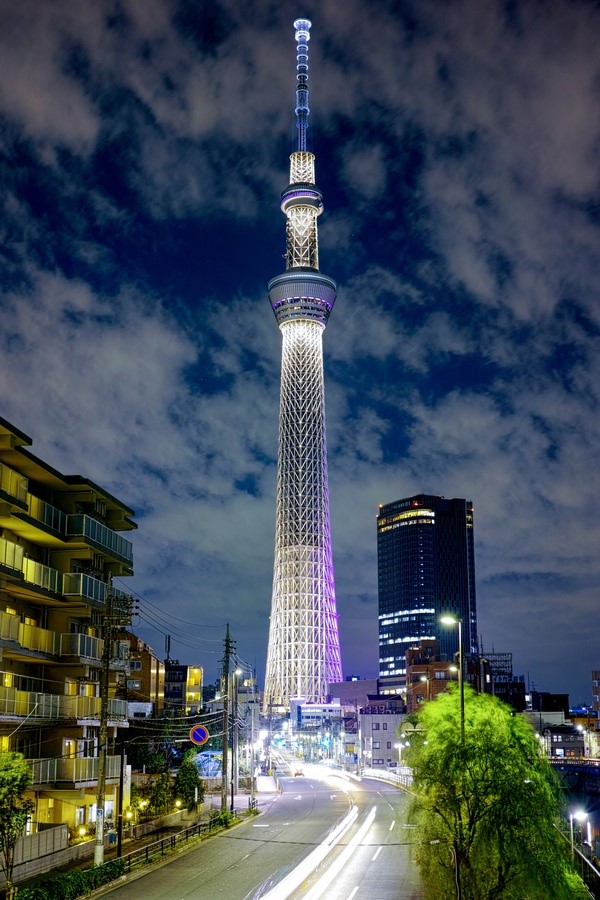 东京晴空塔(634M)是是世界上最高的自立是电波塔,每到夜晚时分会点亮代表「精华」「雅致」的淡蓝与蓝紫的灯光,交织挥映出浪漫美景。