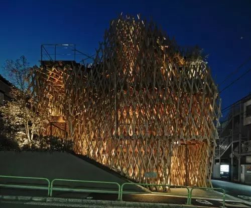 「城市里的森林」是隈研吾设计微热山丘Sunnyhillls青山店的建筑概念,整体桧木建筑结构,以独特的接榫组合,巧妙的连接变化成一个个深入云中的独特窗格,白天阳光在交错的木条间撒下错落游移的阴影并晒出原木的香味,在冬夜雾中则成了一个透着朦胧火光的灯笼伫立湿润的街角。每个时段都透露不同的美,空间内的光影也会随着太阳的东升西落堆栈出各种角度与层次。