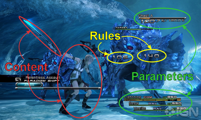 在这个最终幻想八的截图中,内容是怪物,角色,还有那么使用的武器,参数是那些影响着战斗的内容数值,比如角色血量。当英雄们挥舞着武器冲击怪物时,规则决定了伤害数值的大小,这些规则都会使用角色的参数,或者随机数。