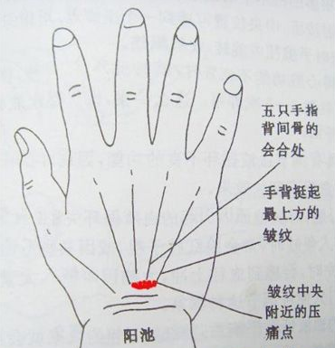 “阳池”,阳光的池子,可以囤聚太阳的热量。刺激这个穴位可以恢复三焦经的功能,将热能传达到全身,简直就是你身体内一个看不见的小火炉子,冷的时候打开它的闸门,火苗一会儿就窜上来,全身马上就觉得暖和了。阳池穴位于人体的手腕背横纹正中,往前对着中指、无名指的指缝。按摩阳池穴时,动作要慢,时间要长些,手法要轻柔:两手交替用中指以轻柔力量慢慢按压另一手的阳池穴。按摩了阳池穴以后,再顺便按摩涌泉穴,它是肾经里的重要穴位,可以促进血液循环,强筋壮骨.