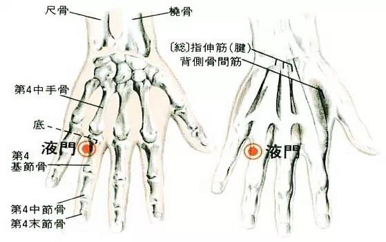 液门穴就是一个这样的穴位,是一个消炎的药库,如果我们能善用它,很多疾病能当下见效。液门,顾名思义:液体之门。人身的血液,精液,津液,关节液,小便,包括痰液,唾液都是液体,液体属性为阴,液体在人身经络脉管之中循经而行,各行其道,液通气行,相安无事,何病之友?人体有时表现的上火,并不完全是人体火多了,或者说水少了,很多时候,是液体循行的道路不通畅了,有堵塞了,表现在堵塞的局部有病痛了,这时要想办法疏通液体循行的道路,液门穴当仁不让,我们可以用指压按摩,或针灸治疗,都会有效的,不少上火的症状当下能完全消失。