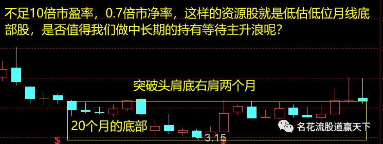 一轮行情对一个板块的炒作是一定要出现泡沫的,比如茅,在2627元的时候,就是达到了历史泡沫区80倍市盈率,然后调整下来。等待业绩的再次增长还是会再次回到泡沫区。同时酒的板块先驱是一线二线白酒,最终传递到所有酒股,板块整体完全透支估值出现大泡沫。资源板块出现泡沫了吗?显然没有。有人看细分行业板块指数觉得高了,你要知道,有色指数是被中国铝业带动控制的,钢铁指数是被宝钢控制的,煤炭指数是被中国神华控制的,它们也是行业茅,这跟酿酒指数被茅台先行控制是一样的。但是,资源三驾马车中很多还在低位徘徊,它们会借利报表在不同时期来做各自的主升浪。比如在这次的年报与一季报行情中煤炭601699翻倍就是典型案例。这样的案例,我觉得在未来的中报预期中资源低位个股还会黑马频出。最终资源整体也会如酿酒最终全部爆发补涨,当然业绩高增长低估值的底部股是重中之重。来看下面这样的月线底部股。