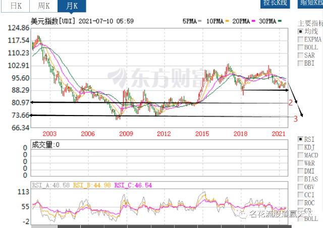 如上图日线很明确了,这次下跌就是漫长的大C浪的开始。【有人留言对我说,我根本不懂浪,再次下跌不是大C,是大三浪,我说你说的对,只要我们趋势方向是一致的即可】。月线,大双顶,结束B3反弹浪后,第一目标就是双顶的大颈线约88.29,图表1的位置,随后下半年一定跌破这里跌向目标2,中长期明年后的目标去目标3,甚至应该跌破目标3.