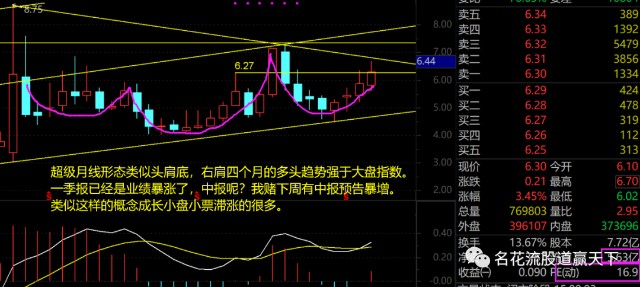 对比指数,只对比这四个月,为什么它能四连阳?我觉得这样的形态,就是主力做半年报增长的预期,如果判断对,最快速的拉升就应该在7月15日中报预告到8月中报正式公告期。