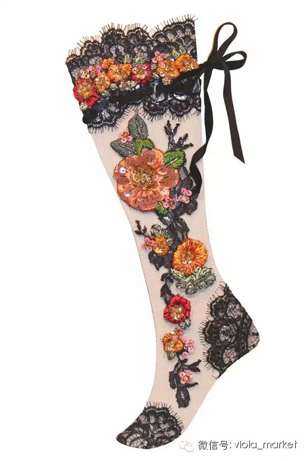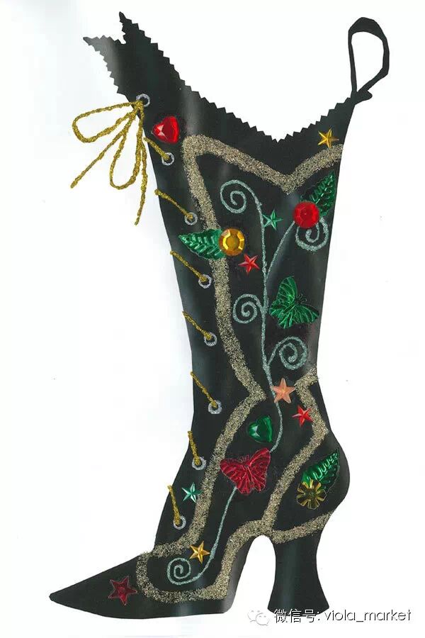 △“我总是被19世纪装饰艺术的稚拙的魅力所吸引。我想让我的袜子是一个维多利亚靴子的形状,就像一个鞋匠的招牌那样。我会用黑色的毛毡剪成这样的形状并且用闪粉和亮片来装饰它。”—