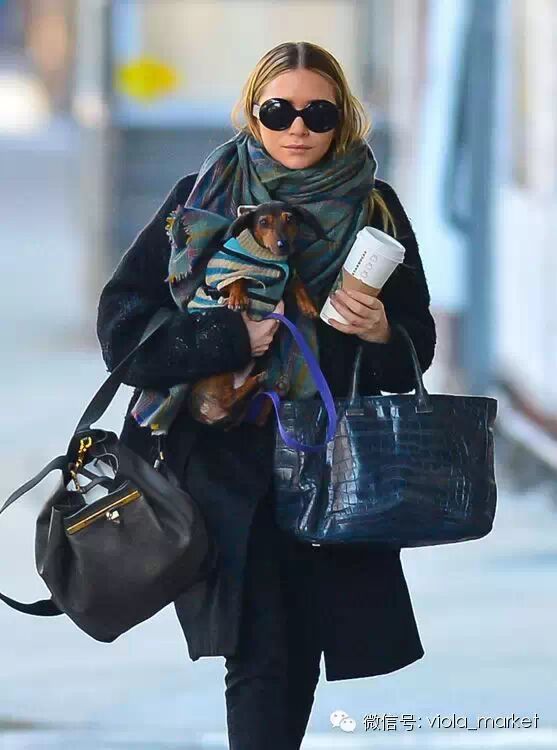 Ashley Olsen精心挑选狗绳与狗狗毛衣来match自己的着装。