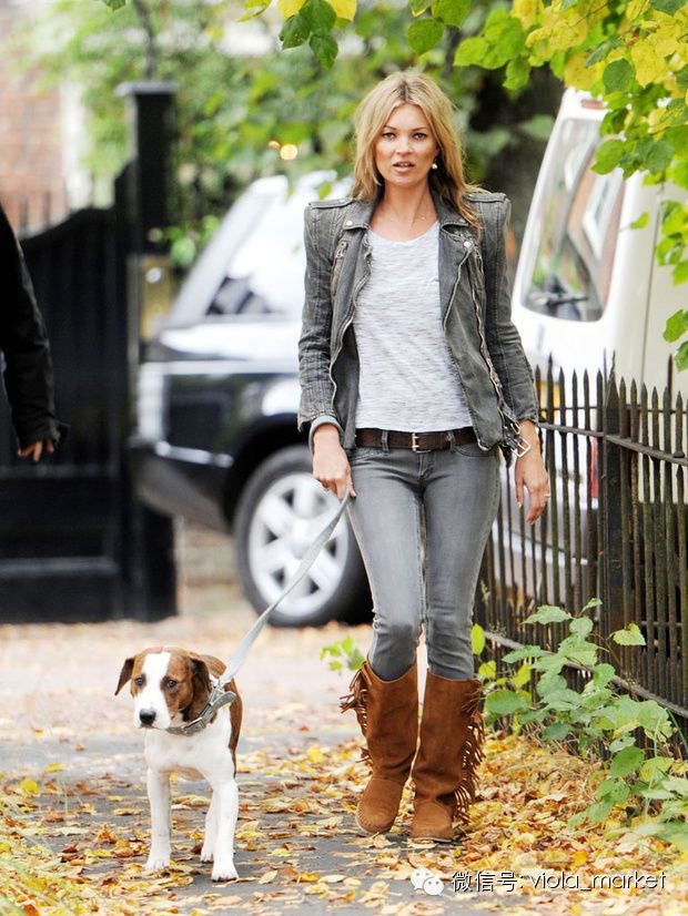 KateMoss最爱机车夹克,与狗狗在一起也最常见到机车夹克。
